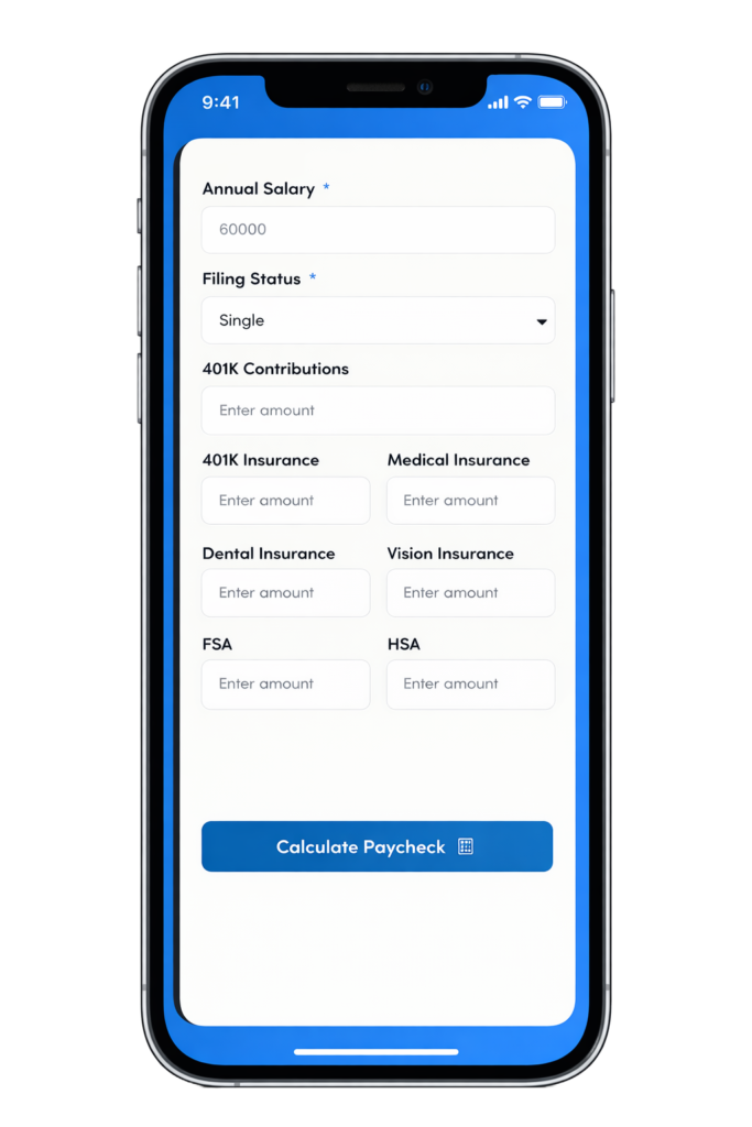 A salary paycheck calculator is a free online tool that estimates your net pay (take-home pay) by applying federal taxes, state taxes, FICA withholdings, and voluntary deductions to your gross annual salary or hourly wage. Enter your salary or pay rate, select your state and pay frequency, and input your W-4 information and deductions, and the calculator outputs your estimated paycheck amount for that pay period.